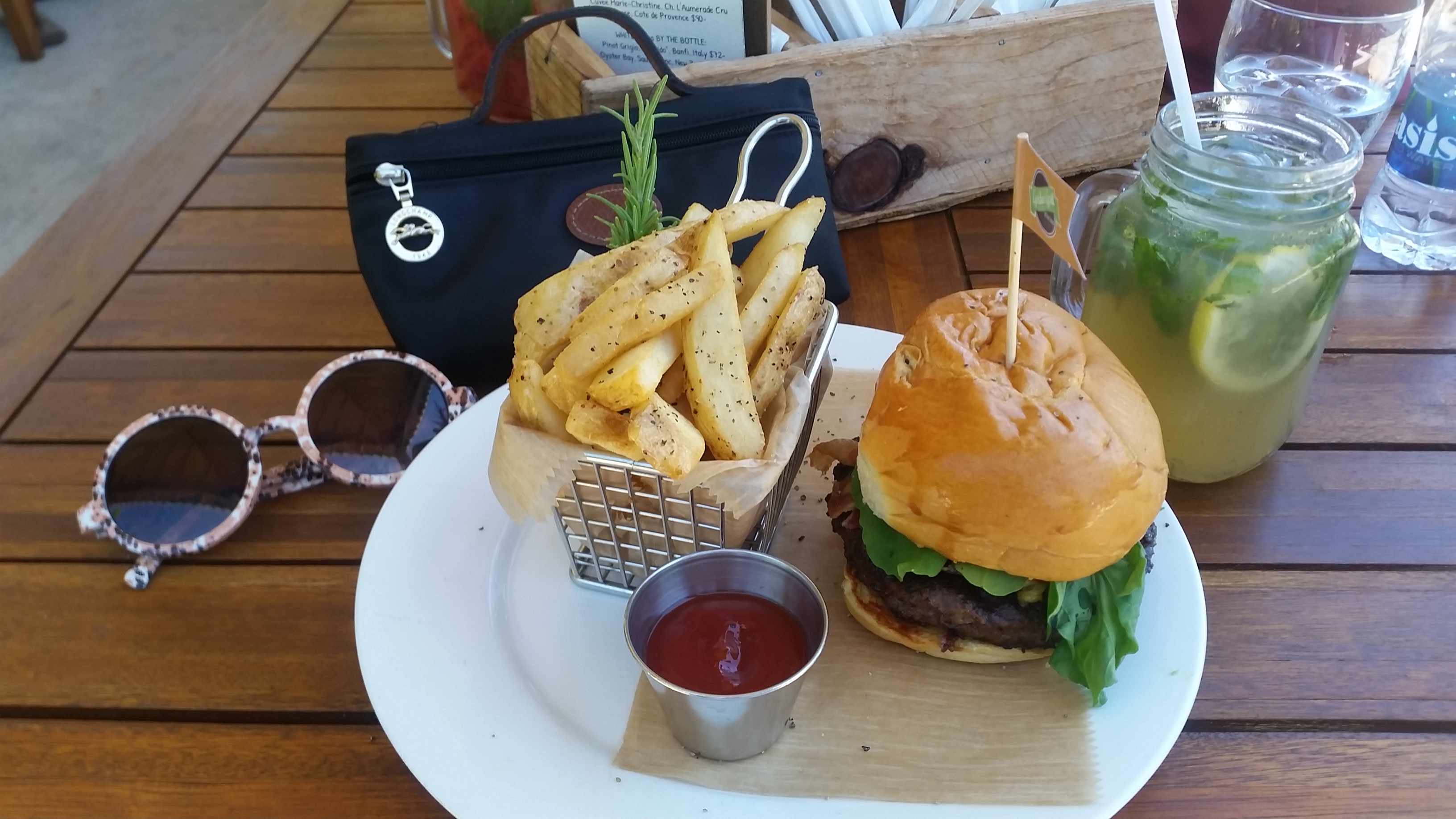 Before you enter, you’re greeted with chalkboard signs welcoming you as well as views of the garden and a pool that you’re welcomed to use. It’s an outdoorsy setting; seating arrangements are under a canopy or up on the deck near the bar/kitchen. It’s always good to make reservations prior to visiting. Unfortunately, Saturday was incredibly hot thus it was slightly uncomfortable.