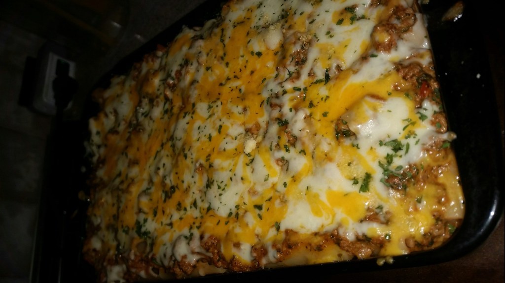 • In a 13″ x 9″ baking dish, layer pasta first, then meat, following with cheese; repeat until to the top. Cover in remaining cheese and parsley.
