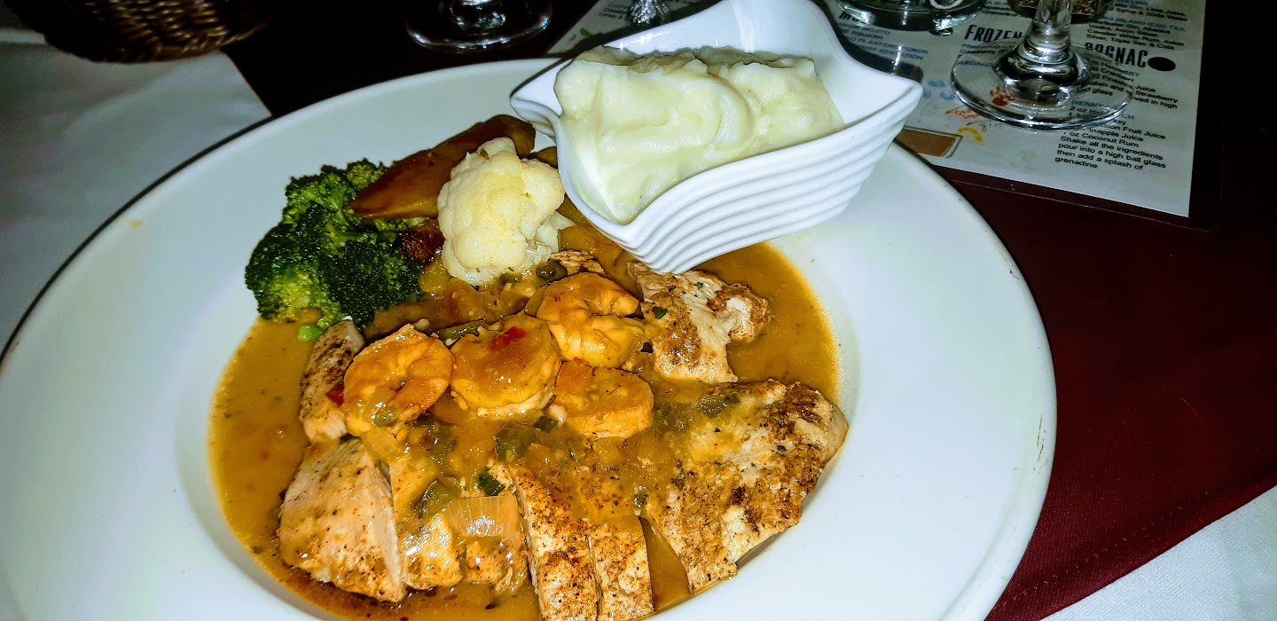 If you know me you’d expect me to have the pasta, however I went out for lunch earlier and had seafood pasta so I decided to try something new. Based on the options listed, I went with the cajun grilled chicken breast served with garlic shrimp sauce, mashed potatoes and vegetables.
