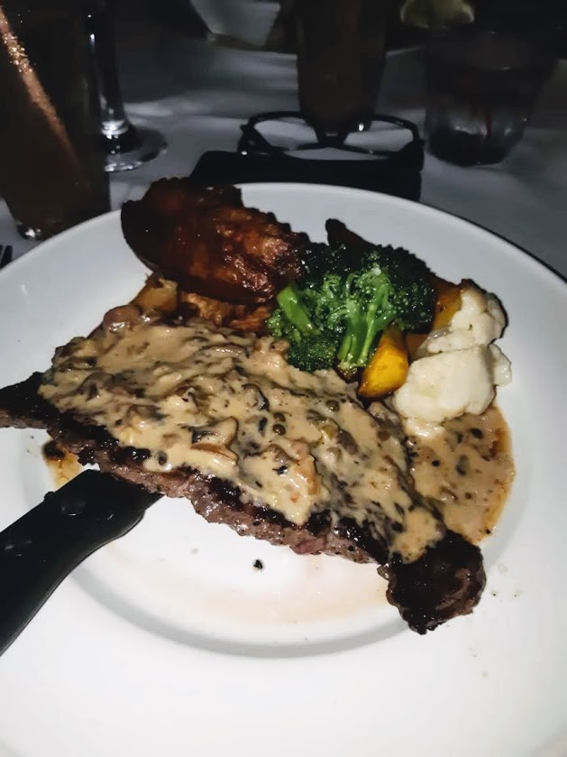 Strip Loin Steak served with a Peppercorn & Mushroom Sauce