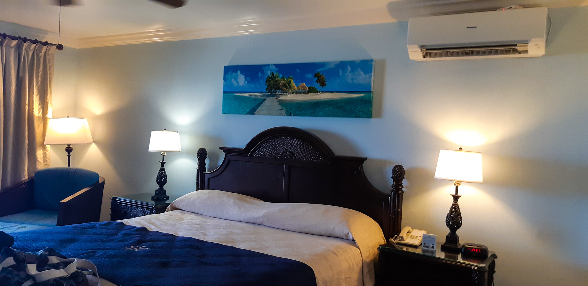 Not necessarily a tour seeing as I didn’t take many pictures. However, we were given a beachfront room (according to their website these are the most spacious guest rooms). Along with a terrace providing beach access, the room featured a king size bed, flat screen TV, shower and tub, double sink, a desk and complimentary items (mini bottles of local rum, hot sauce and jam). The bed was really comfortable, but I believe their bathrooms could do with an upgrade.