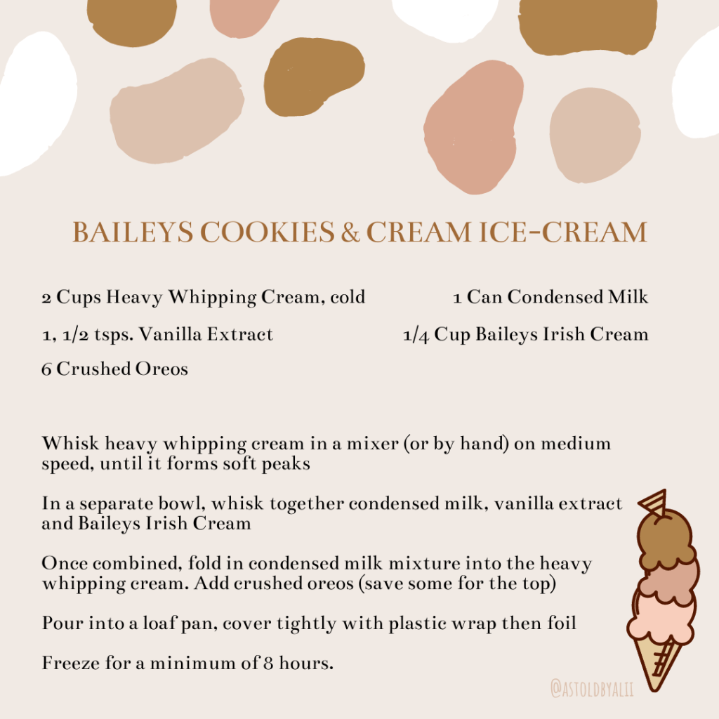 Since making it the first time, I decided to experiment with the recipe a few more times trying other flavours (Pina Colada & Strawberry). They didn’t come out as expected, so I think I’ll have to stick to this base option and add-in substitutes as I go. I first saw someone on Instagram add Baileys to her recipe and I didn’t even have to try it to know it’d be good. Given the fact that alcohol doesn’t freeze, this ice-cream was a nice soft serve consistency. All the information you need to make this dessert can be found below. Enjoy!
