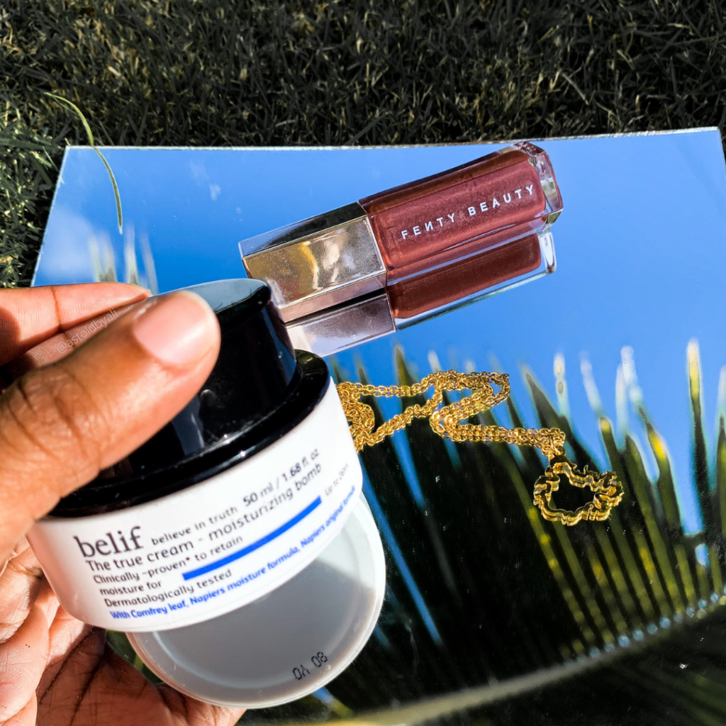 I hardly wear makeup especially now that we’re not going anywhere 🙃 but I still use it every now and again to film videos or TikToks. Lip gloss has never been a staple in my makeup bag but I decided to give it a try. I purchased the standard size in Fenty Glow – shimmering rose nude from Sephora during Black Friday and fell in love with it. Every time I use it I fall in love with again from the scent; it also leaves my lips feeling and looking luscious.
