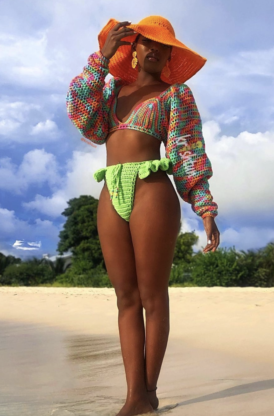 Save the best for last? No bias, but these crochet swimsuits are absolutely amazing. This brand is the DEFINITION of diversity. Her handmade crotchet swim designs are one-of-kind. She offers swimsuits, coverups, and even hats/durags all crotched and made to order! She’s also fully booked until April 30th and ships worldwide.