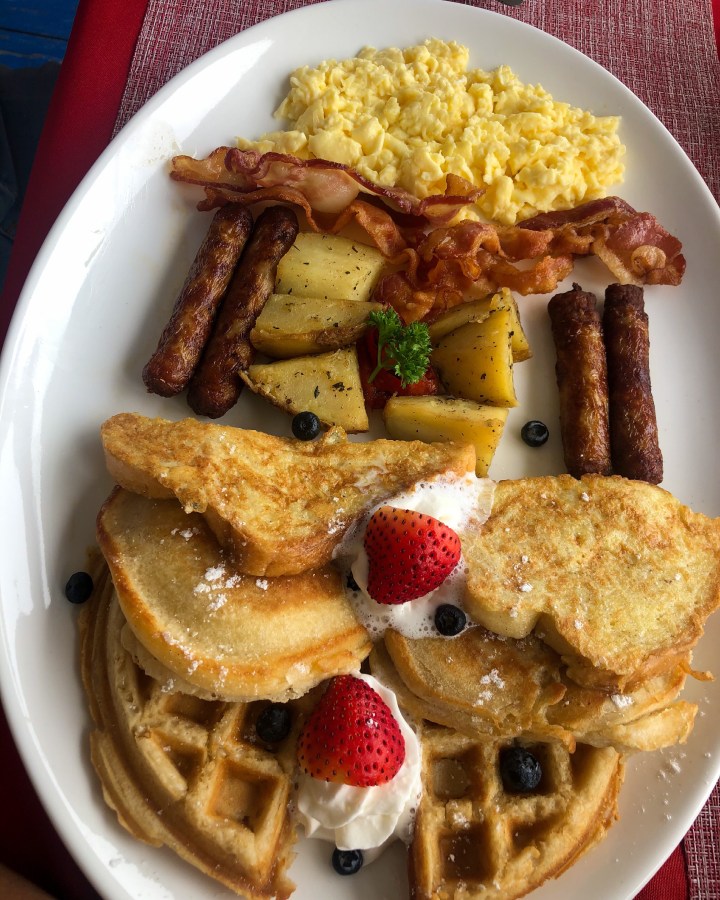 We discovered this while looking on Google maps. My boyfriend was happy with getting local food from a vendor nearby but I was not. This restaurant is located on Dockyard Drive, you could walk if you feel like but we drove. The menu had your usual stuff, pancakes, eggs, bacon, french toast etc. I opted for the omelet with onions and sweet peppers with bacon, while my bf had French Toast with bacon and sausage. After ordering we decided to dine outside, and once again you got views of the harbour from a different angle, yay!