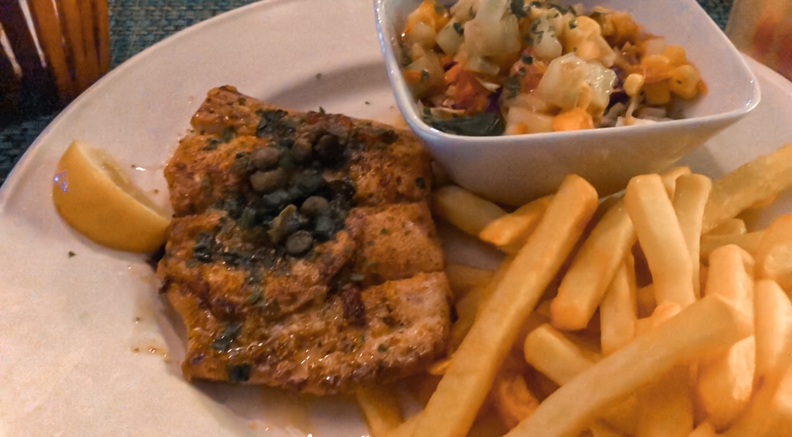 A constant favourite. I haven’t been to this restaurant and left disappointed, so it was a safe option. We decided to sit outside, which was weird at first because it’s right on the roadside, but it was also nice and breezy. All starters are XCD $30, and all entrees are XCD $60, they also had a new summer menu. I was disappointed in the absence of calamari, but got battered shrimp to start and Grilled Mahi Mahi with fries and a salad for my main course. My BF got the Antiguan Jerk Chicken with Mashed Potato and Side salad.