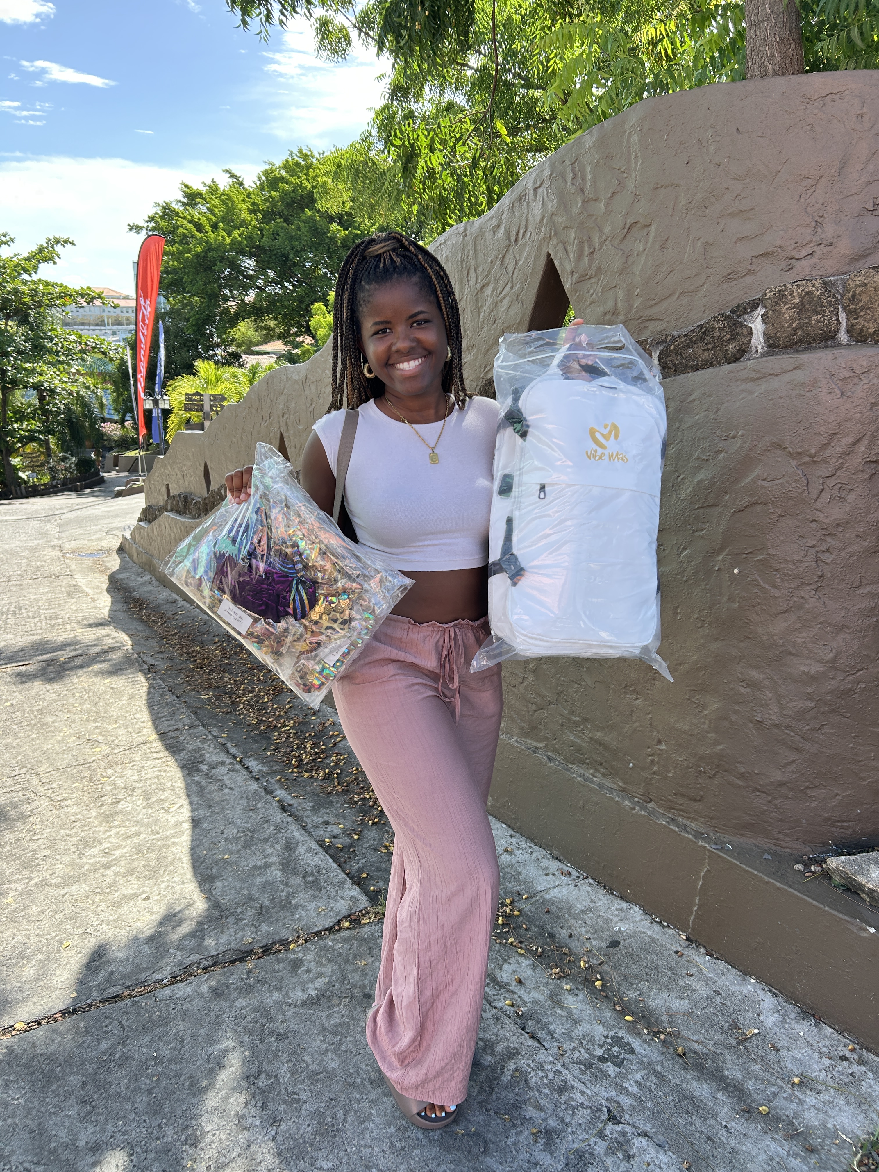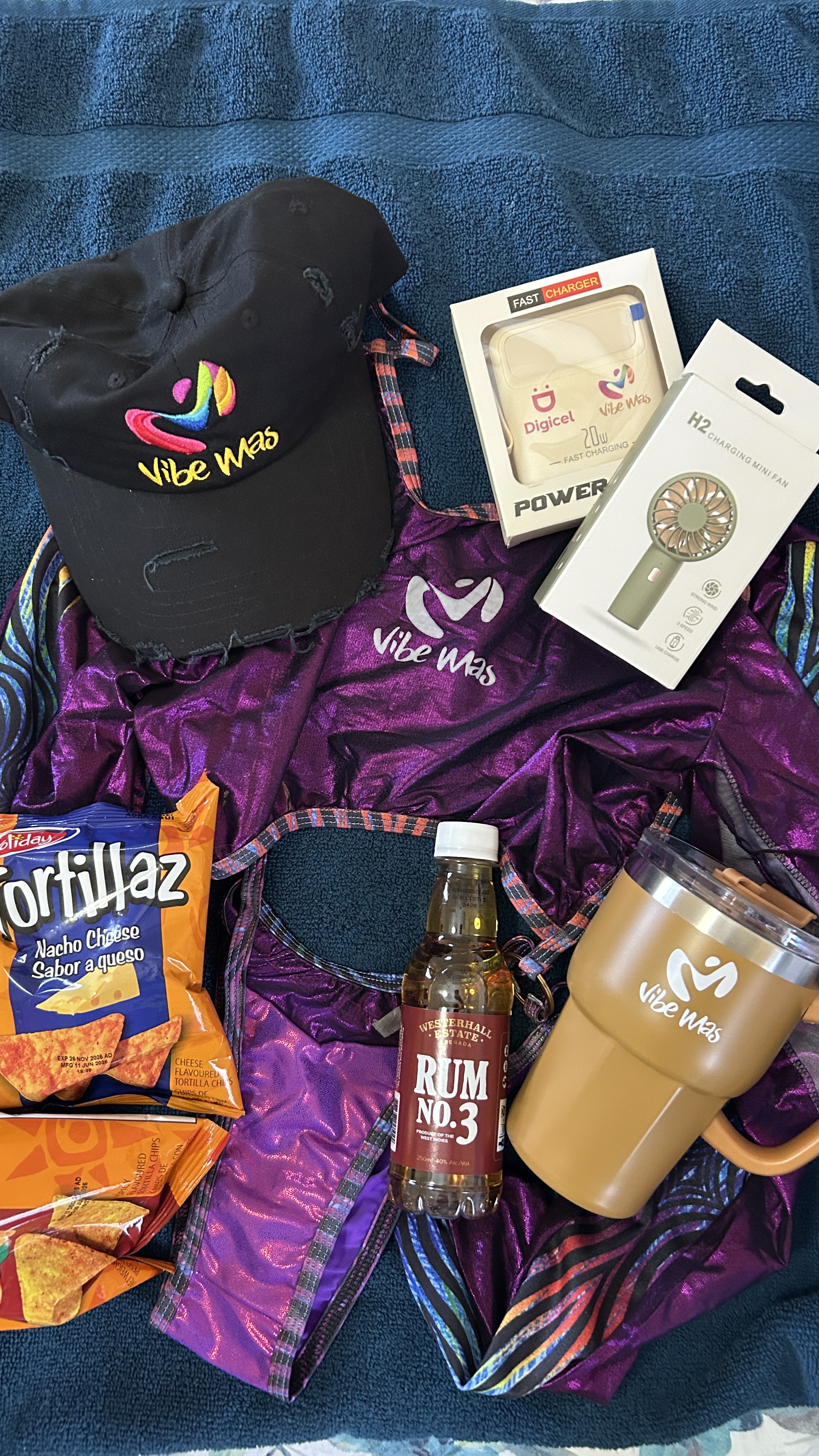 - Goodie Bag (backpack, hat, fanny pack, cups, snacks, fan, portable charger, small bottle of rum)